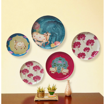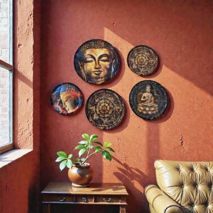The set includes assorted plate sizes (approx. 12 cm, 10 cm & 8 cm diameter), making it perfect for creating an eye-catching wall arrangement. Lightweight and easy to hang, these decorative plates are ideal for living rooms, bedrooms, hallways, offices, pooja rooms, and cafés.