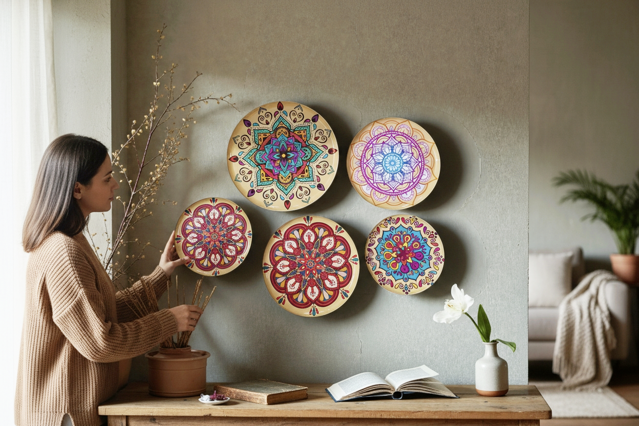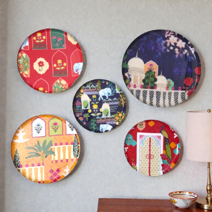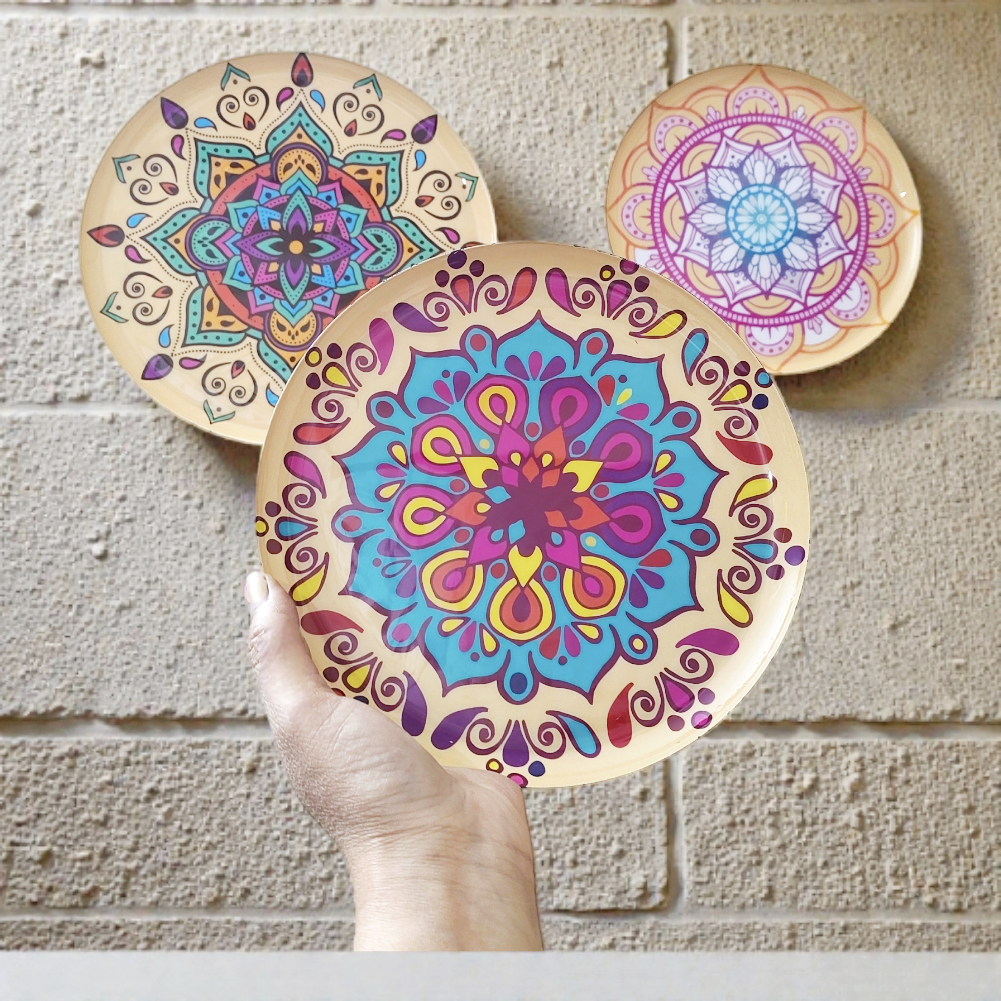 - Set of 5 Metal Wall Plates – Handcrafted decorative plates with vibrant mandala designs