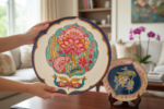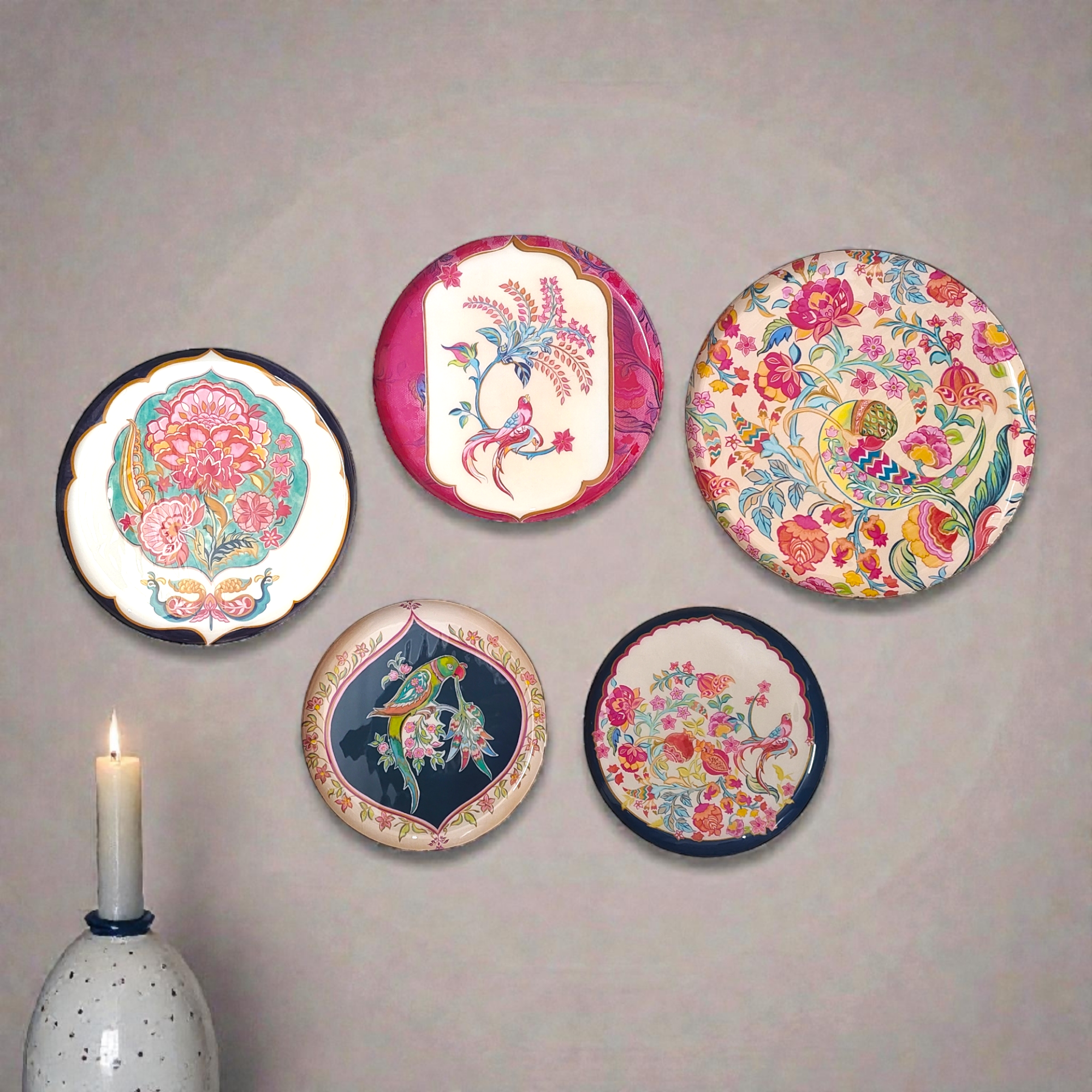 - Set of 5 designer metal wall plates with floral and bird art themes