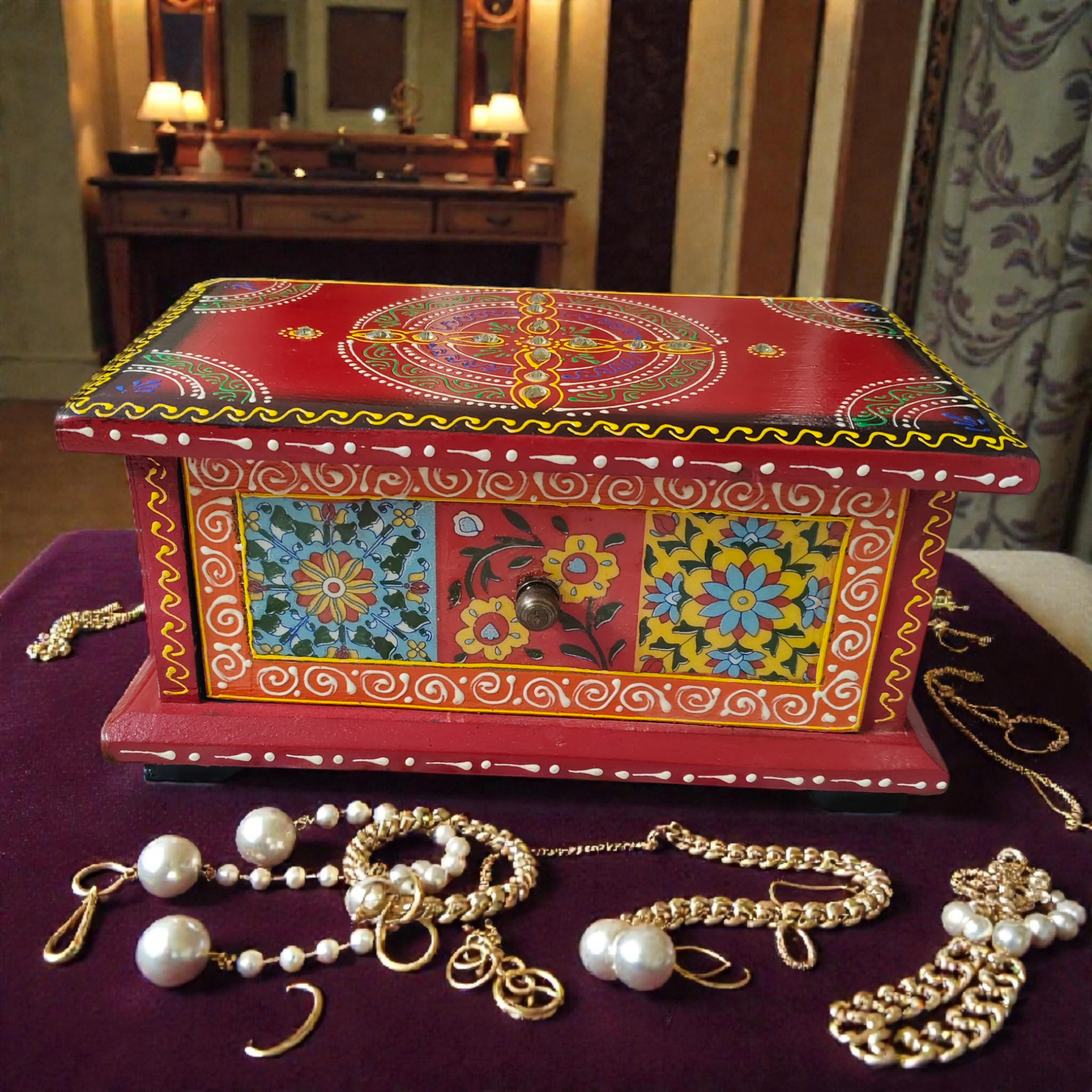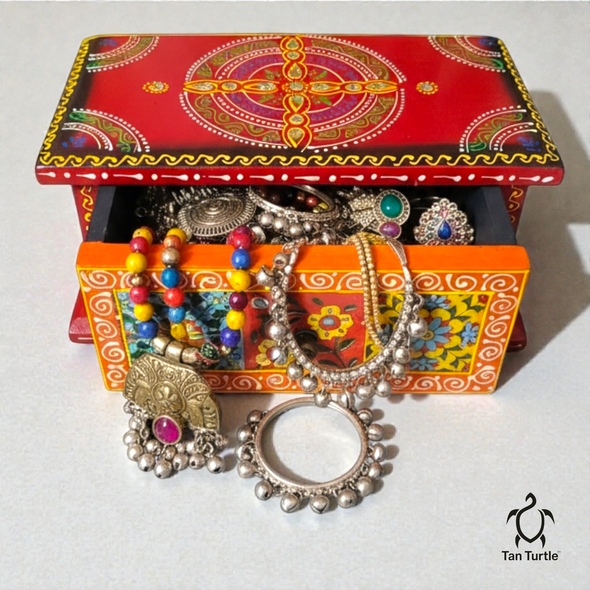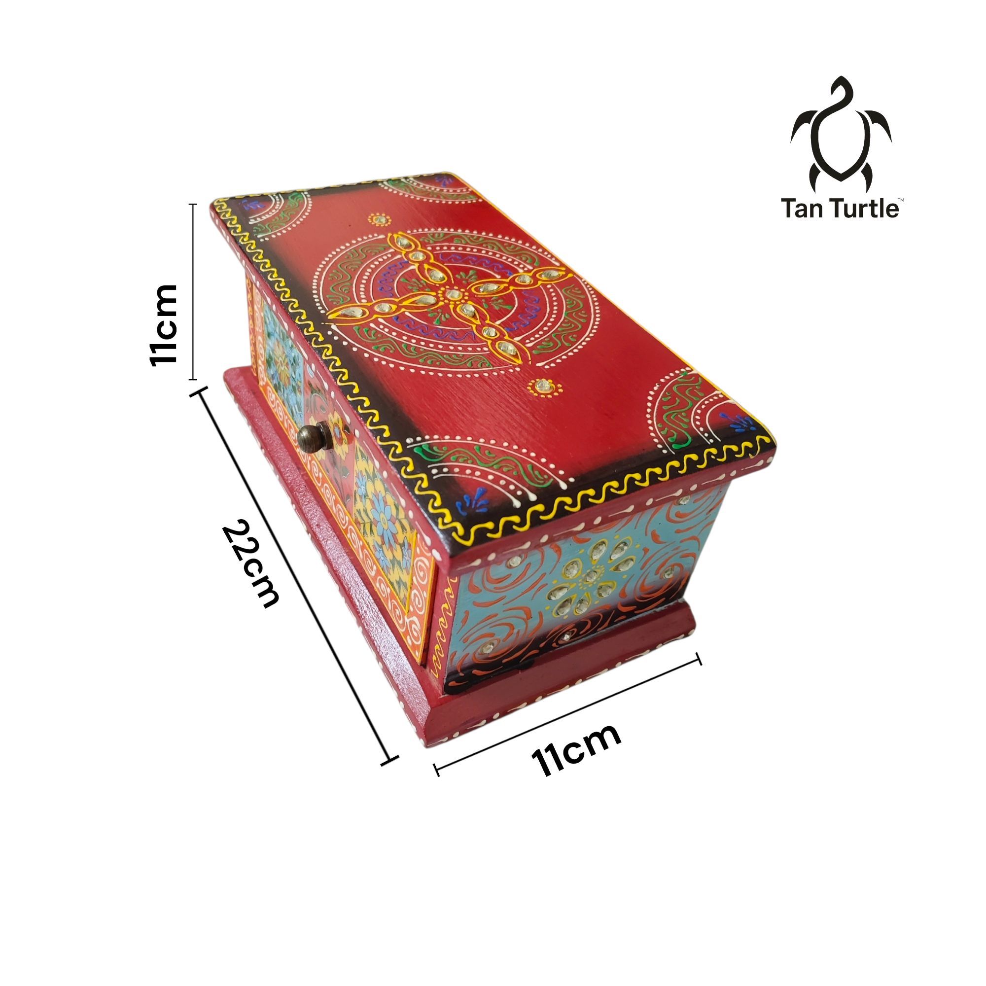 Bring home the charm of traditional Indian craftsmanship with this beautifully hand-painted wooden storage box from Tan Turtle. Designed with intricate motifs and vibrant colors, this box adds a touch of elegance and culture to any space. Perfect for gifting, home décor, and everyday storage.