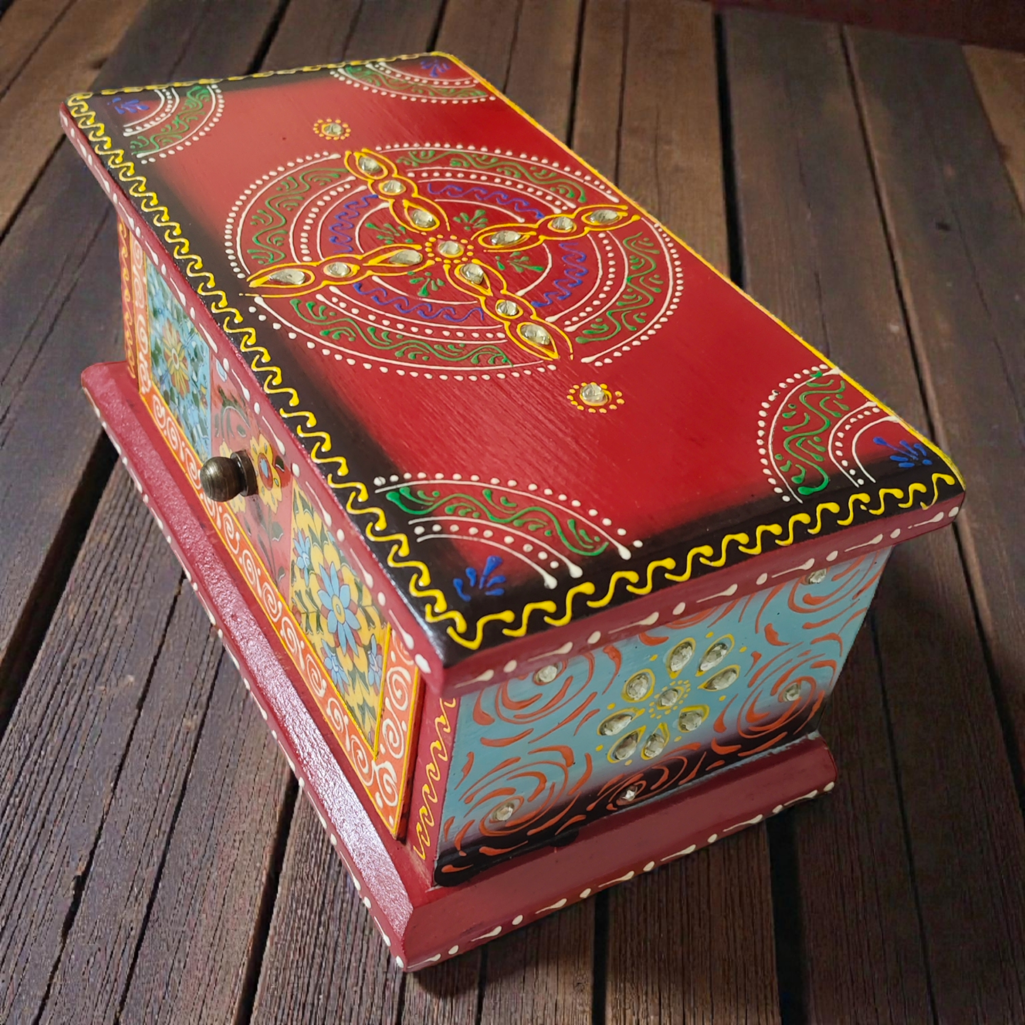 Vintage-Inspired Look – A blend of painted wood and ceramic tiles gives the box a distinctive ethnic-meets-vintage appearance.