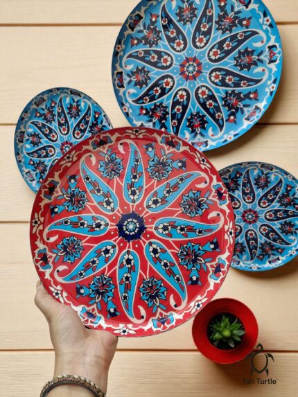Original price was: ₹999.00.₹899.00Current price is: ₹899.00.Tan Turtle Decorative Metal Wall Plates for Home or Wall Decoration (Turkish Floral, Red & Blue, Medium)